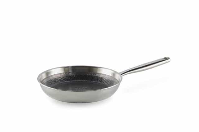 Zoals de naam al doet vermoeden is deze koekenpan uit de Habonne Hybrid lijn een hybride pan. Hybride betekend in dit geval een mix van een rvs- en een antikleefpan. De drielaags pan (tri-ply) is voorzien van een 100% PFAS vrije keramische coating. Deze coating ligt iets verdiept in het hexagon motief waardoor deze goed bestand is tegen krassen en beschadigingen. Een pan voor jaren die ook nog eens een mooie korst op je product bakt en gemakkelijk in de reiniging is. Vanzelfsprekend te gebruiken op alle warmtebronnen. 10 jaar fabrieksgarantie
