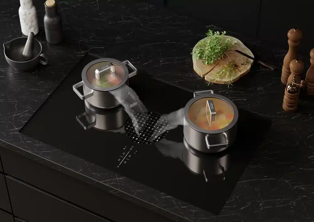 Het nederlandse merk Koqi heeft met hun pannen, die speciaal ontwikkeld zijn voor downdraft afzuiging, een schot in de roos! Schitterende design pannen gemaakt van de mooiste materialen en perfect voor wanneer je een kookplaat met geintegreerde afzuiging hebt zoals die van Bora, Miele, AEG of Siemens. Door het handige deksel wordt de stoom en nare etensgeuren direct geleid naar de afzuiging. Ook zijn de pannen makkelijk af te gieten zonder dat je de deksel schuin op de pan hoeft te leggen. Zie ook de bakpannen ,waaronder de koekenpannen en de wok. die zijn voorzien van een 100% PFAS vrije keramische antikleeflaag. De pannen zijn zowel los verkrijgbaar als in sets. In de sets heb je een stuk voordeel in prijs.