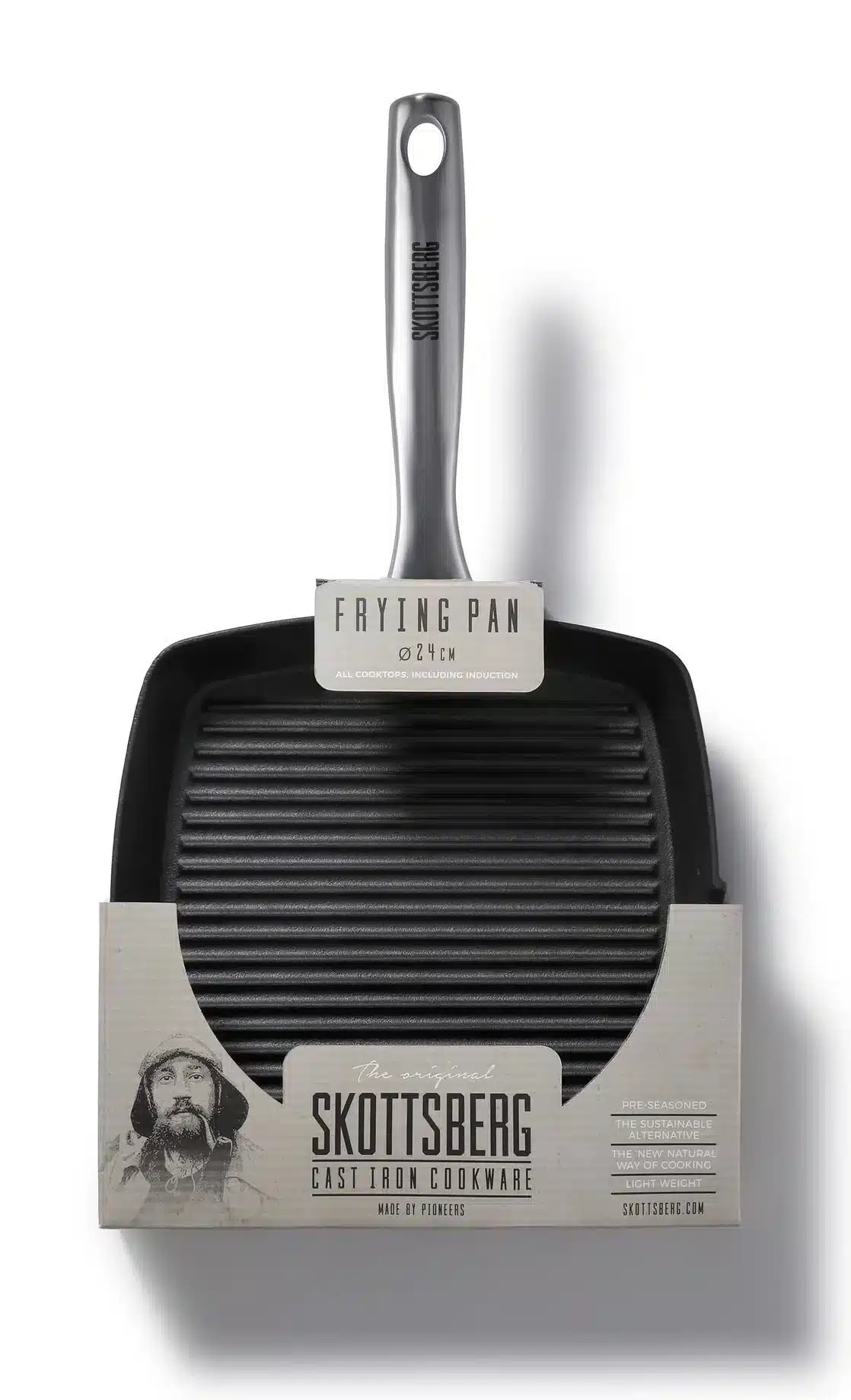 Deze onverwoestbare grillpan is gemaakt uit één stuk traditioneel gegoten gietijzer. Handig om je armspieren mee te trainen, maar nog veel beter geschikt om eens een stevig potje te bakken en te braden. Het duurt even voordat dit paradepaardje van Skottsberg warm is, maar hij houdt de warmte extreem lang vast, ideaal dus voor braadavontuurtjes die wat langer nodig hebben. Het heft van deze grillpan is hol, waardoor deze niet warm wordt en goed vast te pakken is.
